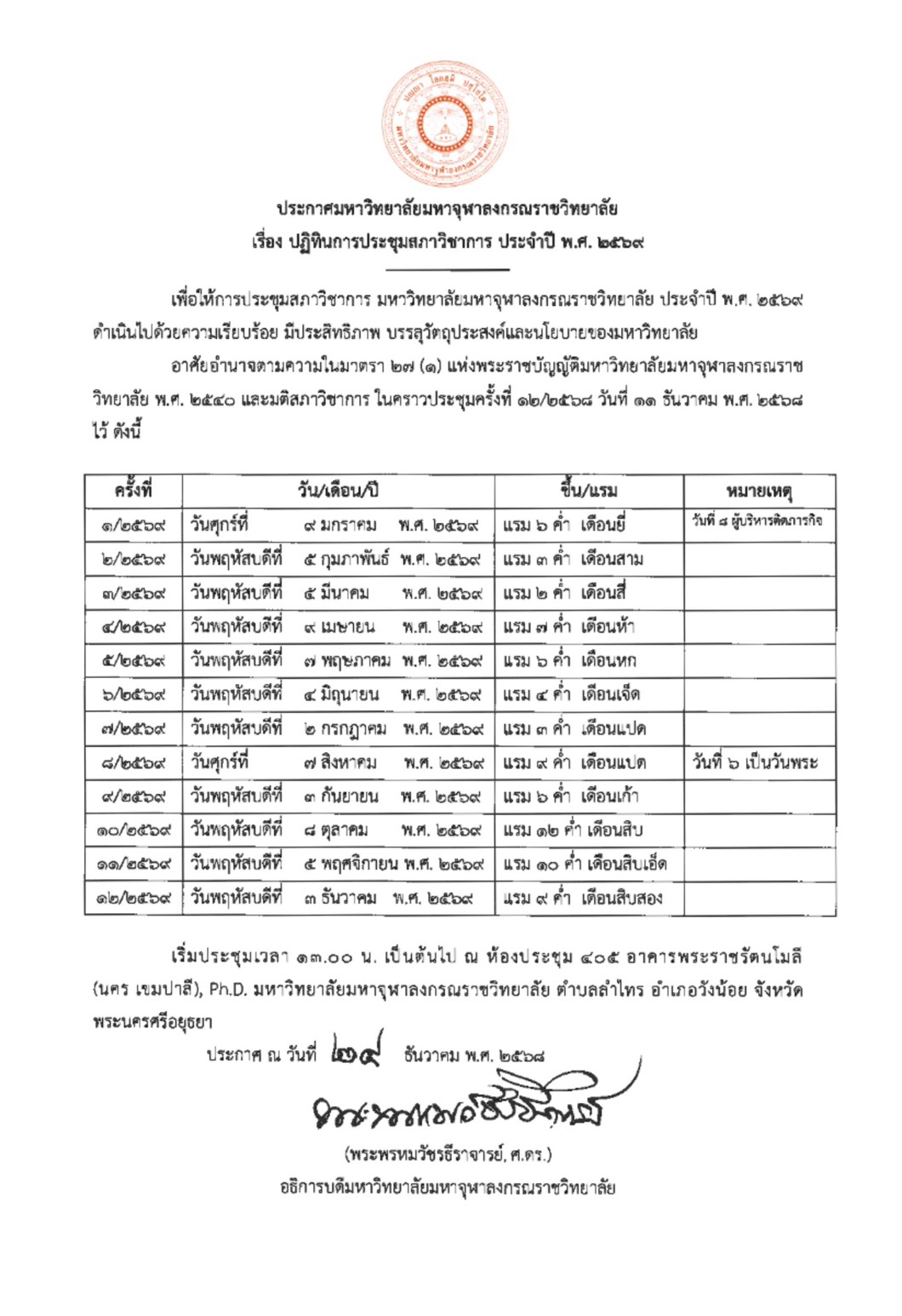 ปฏิทินการประชุมสภาวิชาการ ประจำปี พ.ศ. ๒๕๖๙